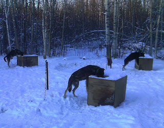 Synchoronized sled dog eating. Now if that was a sport we would nail the competition. It is great to see the doggies coming back from some longer runs and hitting the food right away. Jason is running a lot of 35-40 mile runs right now and trying to keep the dogs up on miles and healthy during this unseasonable November cold snap. We are seeing alot of -40 and -50 below zero tempertures and setting records here in the Fairbanks area. Hoping that it is not a theme for the winter and it warms back up and spits out a lot more snow. We are working really hard on keeping all the dogs very healthy and nice and fat. Jason has moved to running the sled, which means more work for him until we get more snow, but at least he can stay warmer on the sled. Also he can't stop the sled with all 16 dogs he is training with such low snow right now, which means he has broken the yard up into 3 teams and running a 2 on 1 off schedule. Again a special thanks to all supporting us and we will see you on the trail.